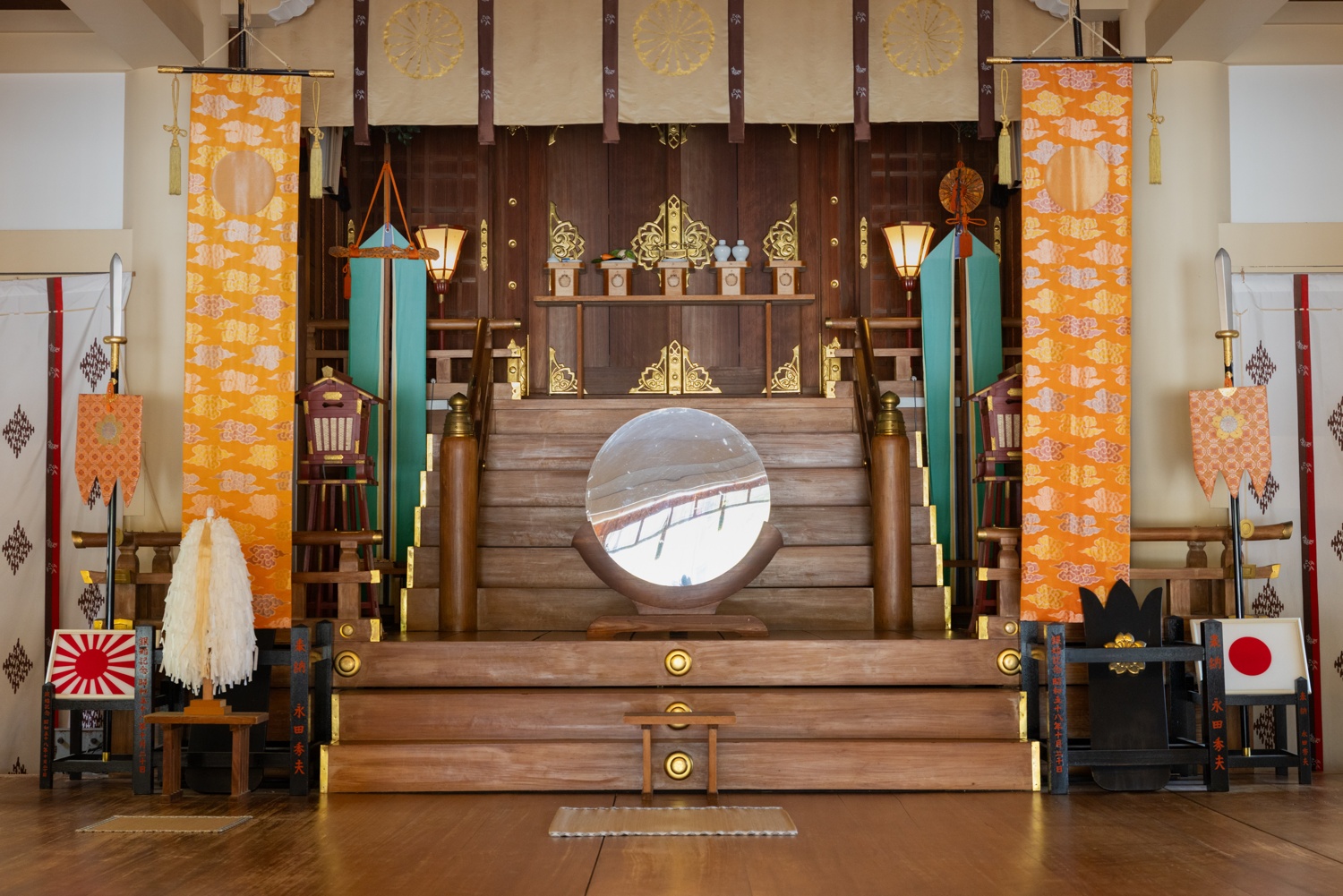 大阪護國神社の御神鏡は長く伸びた参道からでも目を惹くほどの輝きを放ち、